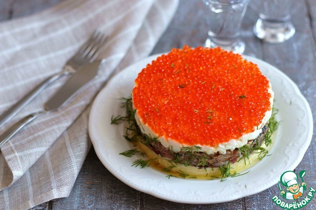 Попалась мне на глаза в продаже форель, как пояснил продавец, по внешнему виду напоминает кумжу. При разделке рыбки, она оказалась вся с икрой. Икорку я благополучно засолила и как вариант, решила приготовить вот такой вкусный салатик. Заходите на страничку рецепта, возможно этот салат, с использованием в рецепте красной икры, вам, уважаемые поварята, придется по вкусу.