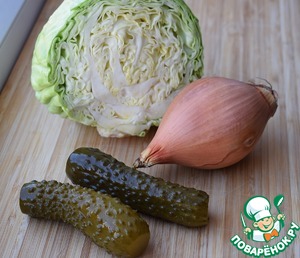 Нашинковать капусту. Почистить и нарезать лук. Нарезать соленые огурцы.