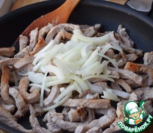 Нагреть сковороду, добавить растительное масло, выложить нарезанное мясо и готовить до испарения жидкости (5-10 мин). Добавить к мясу нарезанный лук, растительное масло (если необходимо) и обжаривать до румяности лука.