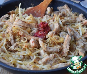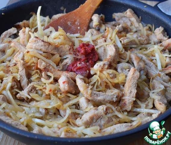 Если посмотреть на пошаговое фото - вот мясо с капустой и луком в сковороде, а следующее фото - просто красивая картинка. Никакого отношения к рецепту не имеющая