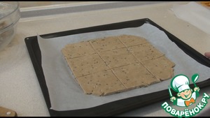 • Подравниваем края теста ножом, можем с одной стороны отрезать, с другой добавить, аккуратно прилепив тесто и подкатав скалкой. Нарежем на прямоугольники или треугольники, как вам больше нравится. Отправляем в разогретую до 180 градусов духовку на 10-15 минут.