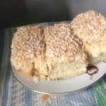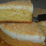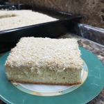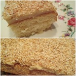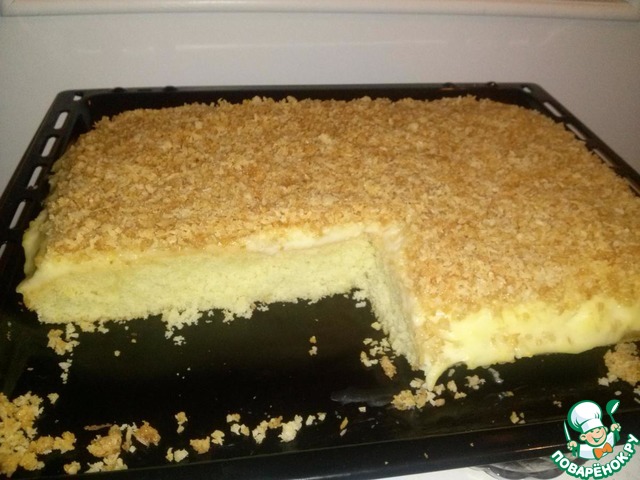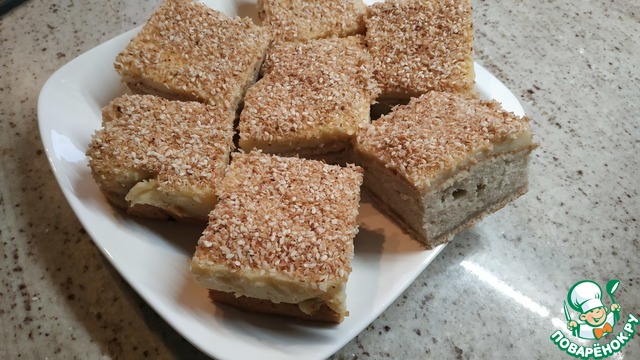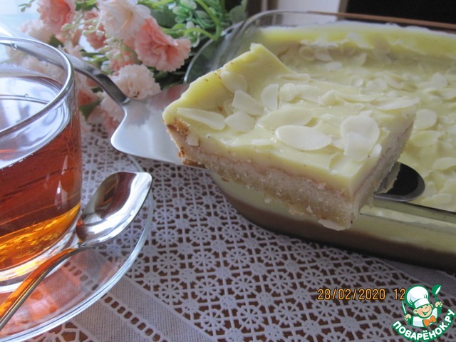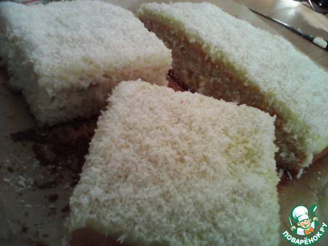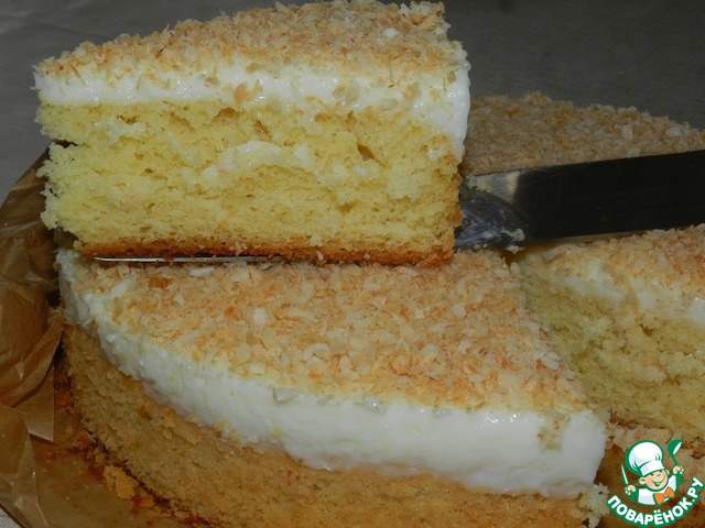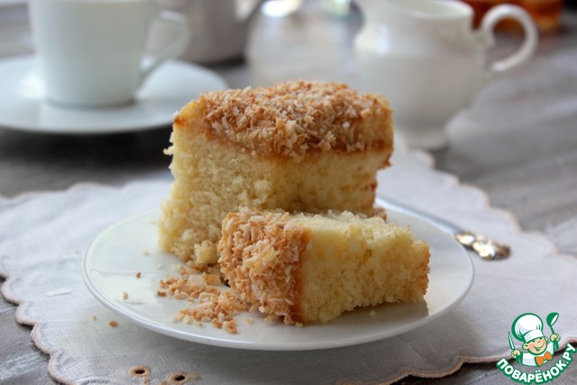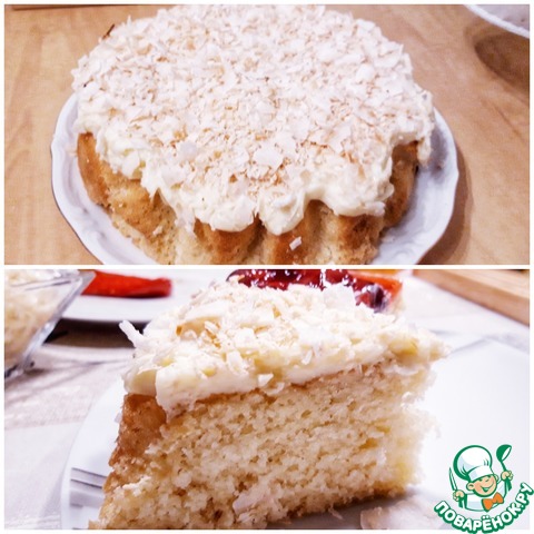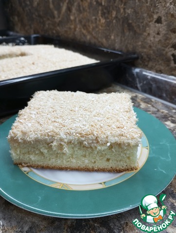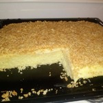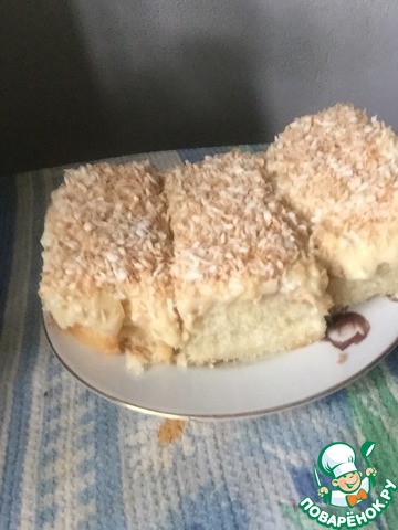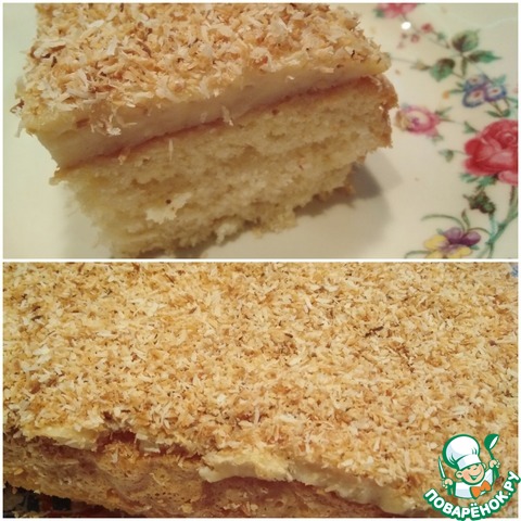 Горячий пирог заливаем горячим пудингом и посыпаем сразу же кокосовой стружкой. Действовать надо быстро, пока пудинг "послушный " и хорошо ложится. Поэтому этого шага у меня нет