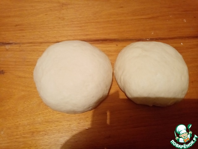 Готовое тесто скатать в шар, вернуть в миску и поставить подходить в теплое (примерно, 30-35 градусов) место на 1-1,5. Подошедшее тесто выложить на рабочую поверхность, подкатать и разделить на 2 равные части, скатать в шары, накрыть пленкой и дать отдохнуть 7-10 минут.