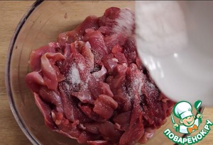 Кладем в посуду нарезанное филе и добавляем две соли. Тщательно вмешиваем массируя в течении 20 минут.