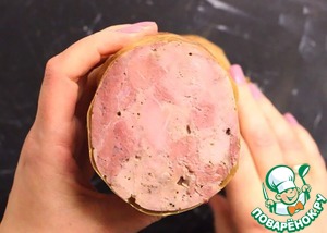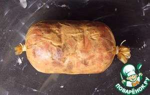 В готовую оболочку полотно набиваем фарш, завязываем с двух сторон.