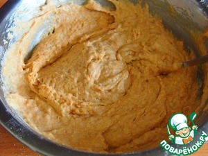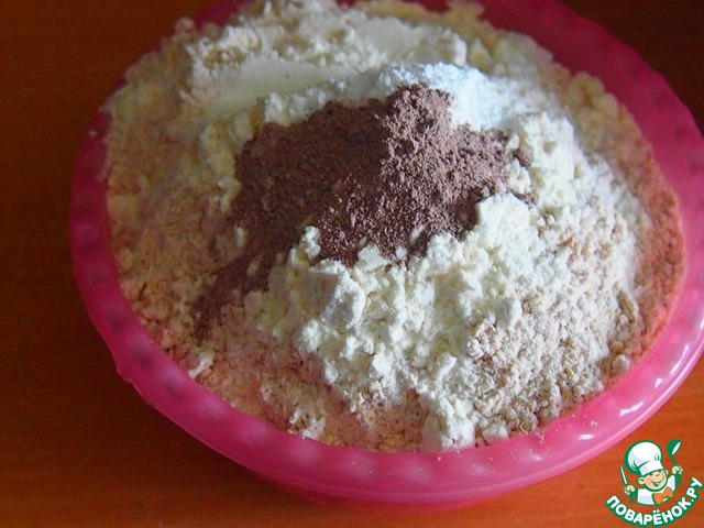 Муку смешать с разрыхлителем, перемешать. Я использовала разрыхлитель для пряников, поэтому темный цвет.