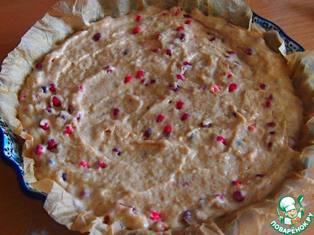 Добавить в тесто бруснику, перемешать. Форму диаметром 24 см смазать маслом и посыпать мукой или, как я, застелить бумагой для выпечки. Вылить тесто.
