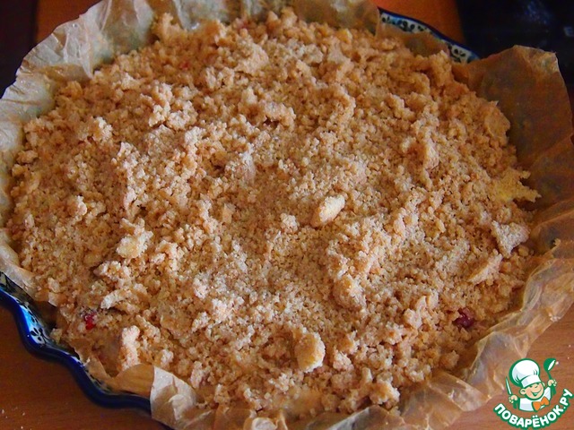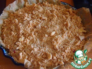 Посыпать пирог крошкой. Поставить форму с пирогом в разогретую духовку и печь при температуре 180 градусов примерно 45 минут, смотрите по своей духовке.
