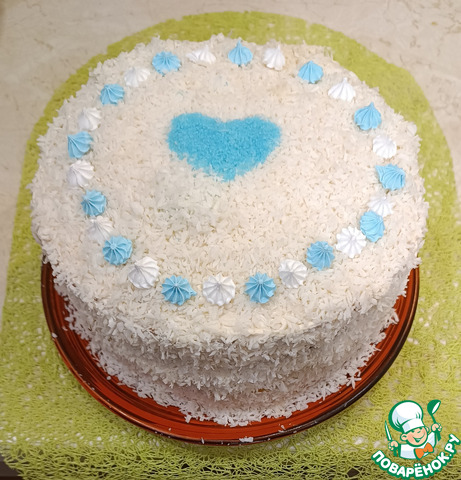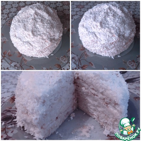 7. Выровнять (при желании) торт остатками крема и присыпать кокосовой стружкой.