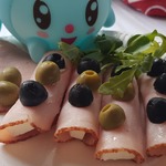 На каждую трубочку положить по маслине. Проткнуть зубочисткой, скрепить края.