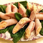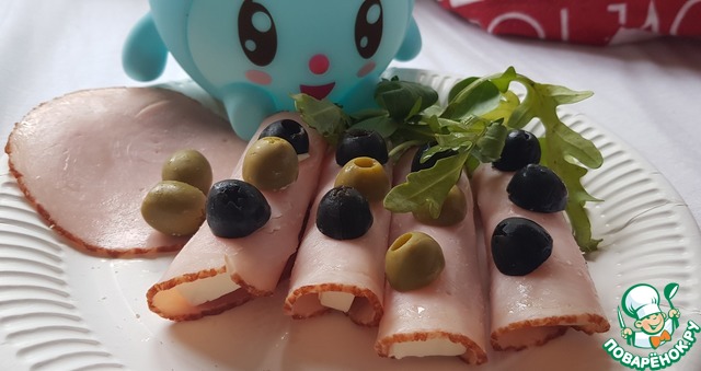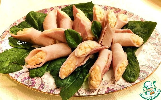 На каждый ломтик ветчины положить сырную массу и свернуть рулетом.