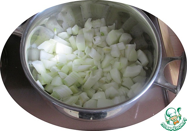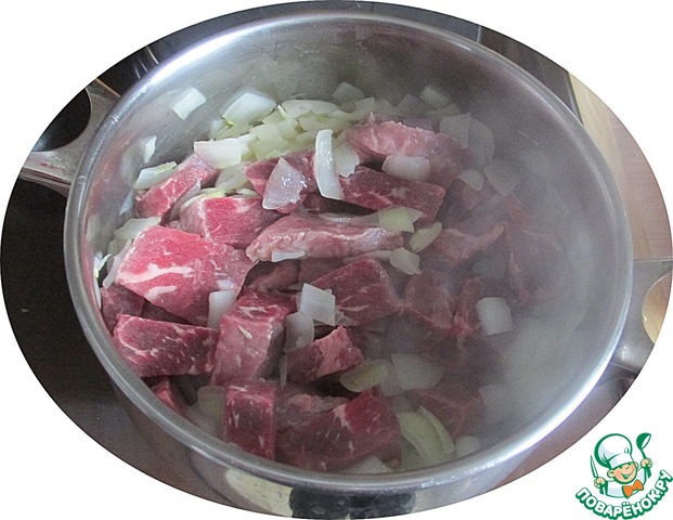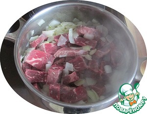 Пока жарится лук, нарезаем мякоть говядины средним кубиком.