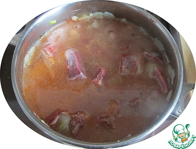 Вливаем воду. Доводим до кипения, убавляем огонь до минимума, прикрываем крышкой и оставляем томиться на 3,5 часа. При необходимости доливаем воду. Потом добавляем соль, сахар и лимонный сок, перемешиваем. Прибавляем огонь до среднего и томим ещё полчаса без крышки.