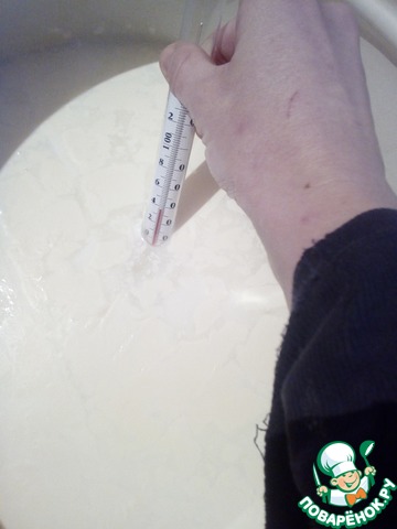 "когда сгусток довели до нужной температуры, в данном случае до 38 градусов, то держать не нужно, а сразу же откидываем.