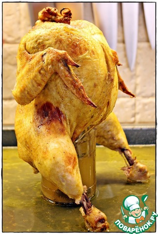 Снимаем курицу с банки проткнув ее под крылом большой вилкой, а второй рукой прокручиваем банку, чтоб она не поднялась вместе с птицей.