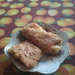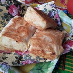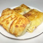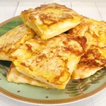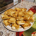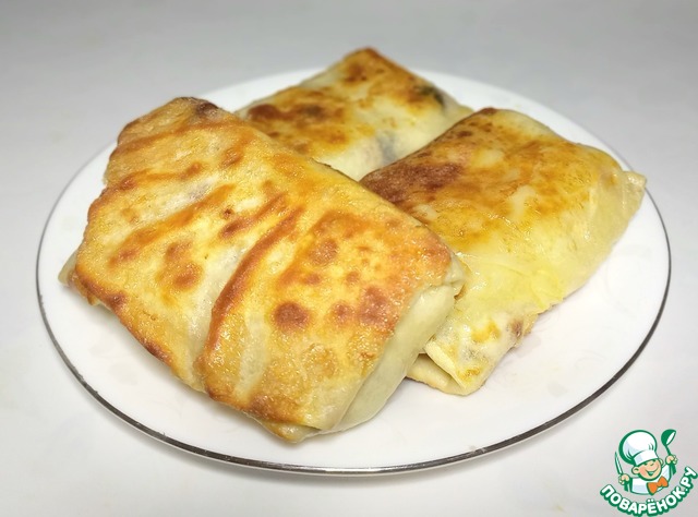 Затем половину листа большого лаваша смазываем этой массой, складываем в 3-4 раза. Нарезаем на части.