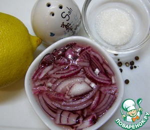Сначала замаринуем лук. Лук можно брать любой, но лучше смотрится красный. Одну небольшую луковицу нарежем тонкими четвертькольцами и зальем маринадом: смешаем лимонный сок (или уксус), сахар и немного молотого перца (перец по желанию). С уксусом лук будет острее.