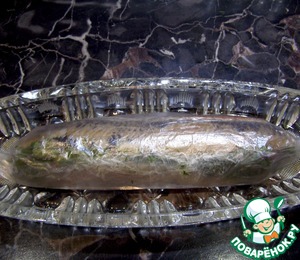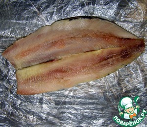 Очистим сельдь и снимем два филе. На каждом филе, со стороны хребта, очень аккуратно делаем надрезы, раскрывая филе как книжку. Постараемся, чтобы сельдь не порвалась. Каждый раскрытый кусочек сельди выложим на пищевую пленку. Вместо пленки я использовала обычные полиэтиленовые пакеты.