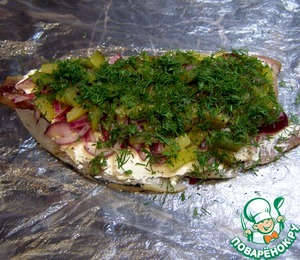 Каждое филе смажем слоем мягкого сыра (у меня творожный с соусом тар-тар) и сверху выложим замаринованный лук. Предварительно лук надо вынуть из маринада на бумажное полотенце и слегка промокнуть.