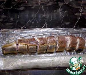 С помощью пищевой пленки плотно сворачиваем филе в виде рулета и убираем в холодильник на 2 - 4 часа. Это нужно для того, чтобы рулет уплотнился и не рассыпался при разрезании.