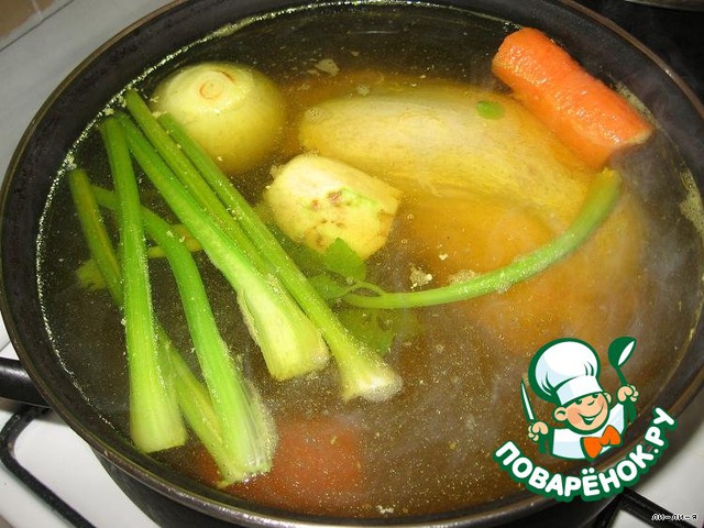 Мясо залить водой. Когда закипит, добавить сельдерей, лук,