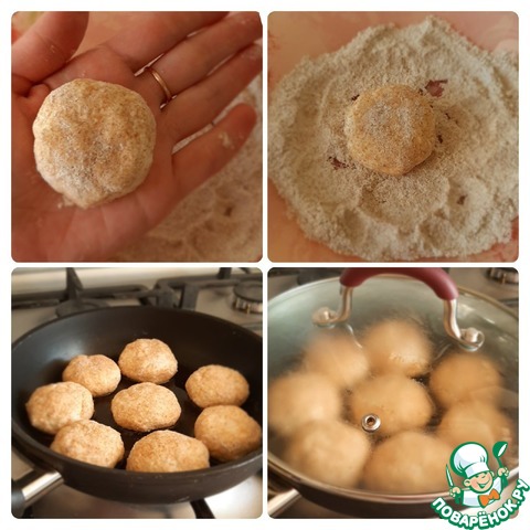 Формируем небольшие колобочки (у меня получилось их 8). Обваливаем в муке и нужно слегка приплюснуть в ладонях. Мой секрет при формировании сырников таков: я ставлю рядом мисочку с теплой кипяченой водой, чтобы получались колобки ровнее и не сильно липло к рукам тесто. Окунаю в нее периодически руки. Выкладываем на сковороду с растительным маслом. Подрумяниваем с двух сторон на небольшом огне, накрыв крышкой. Жарим до готовности.