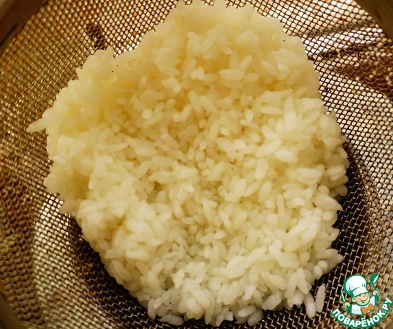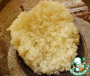 Полуготовый рис откидываем на дуршлаг, промываем холодной водой, чтобы остановить процесс приготовления.