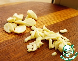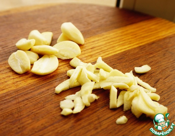 Очищаем 6 зубчиков чеснока и вынимаем из каждого середину (у молодого чеснока можно не вынимать). Два зубчика нарезаем пластинами. Они пойдут в овощную подушку-гарнир.