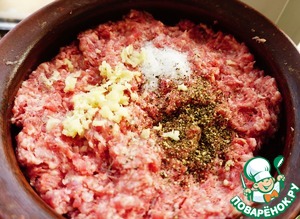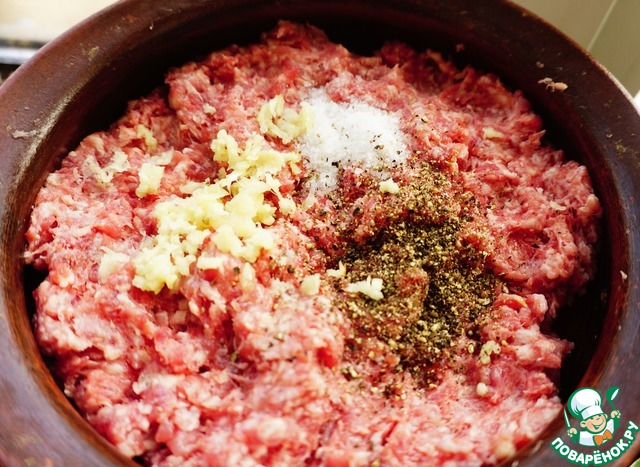 Фарш солим и перчим, добавляем два пропущенных через чесночницу зубчика чеснока. Хорошо вымешиваем.