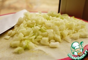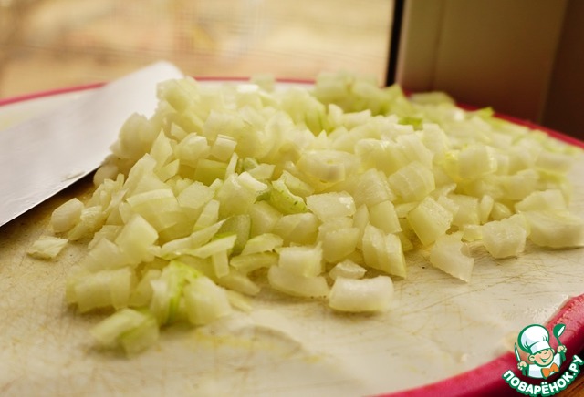 Приступаем к приготовлению овощной подушке. Чистим и нарезаем кубиками луковицу.