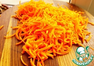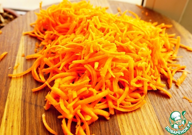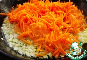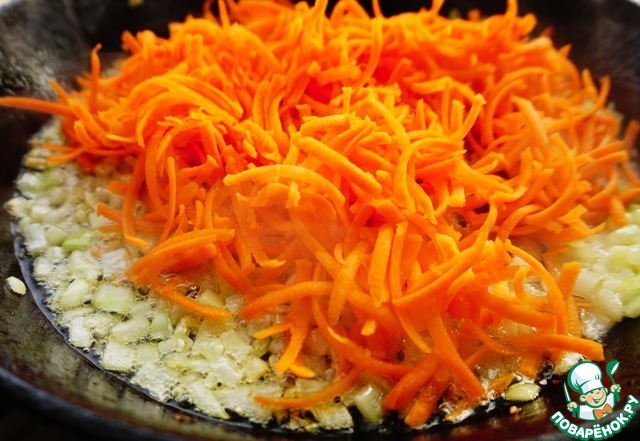 Жарим лук до прозрачности и добавляем морковь. Жарим вместе примерно 5-7 минут.