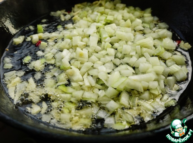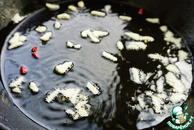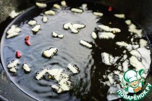 На горячую сковороду наливаем растительное масло. Бросаем в раскаленное масло пластины чеснока и перец чили.