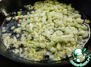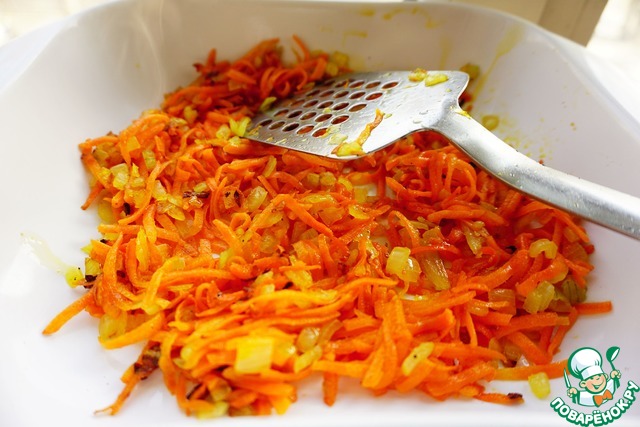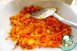 Овощи выкладываем в форму, где будем запекать тефтели. При этом стараемся масло отжать на сковороду.