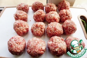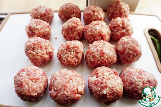 Формируем тефтели. Из такого количества фарша выходит 12 стандартных тефтелей. Так, чтобы было по 2 на порцию. Но, т. к. у меня квадратная форма, я сформировала 16 тефтелей поменьше и по 3 на порцию.