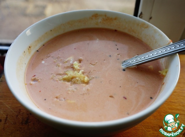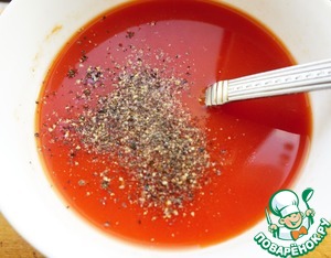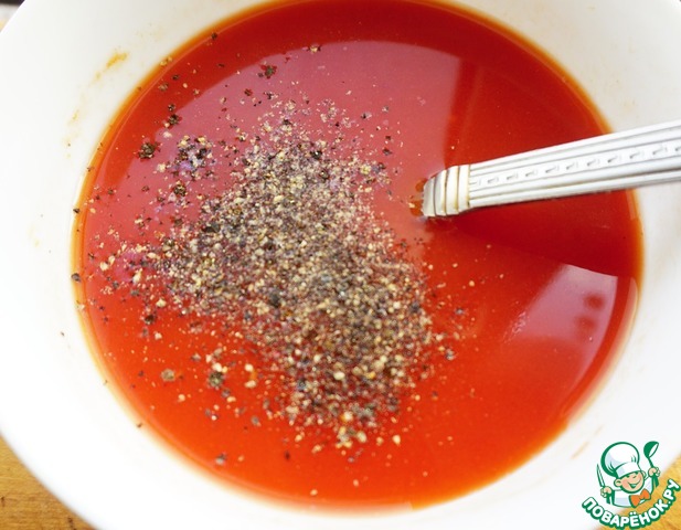 Приступаем к приготовлению соуса. Томатную пасту растворяем его в 250 мл воды или берем 250 мл томатного сока. Подсаливаем по вкусу, добавляем сахар и свежемолотый черный перец.