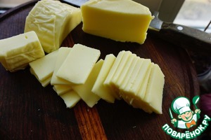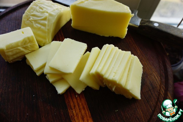 А тем временем, нарезаем моцареллу на пластины по количеству тефтелек. Можно взять и твердый сыр, но с моцареллой будет вкуснее, т. к. она лучше тянется.