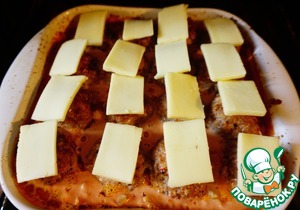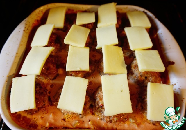Когда пройдет 20 минут, выкладываем на каждую тефтелю кусочек сыра. Запекаем еще 20 минут.