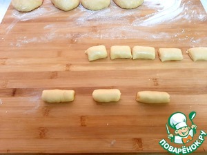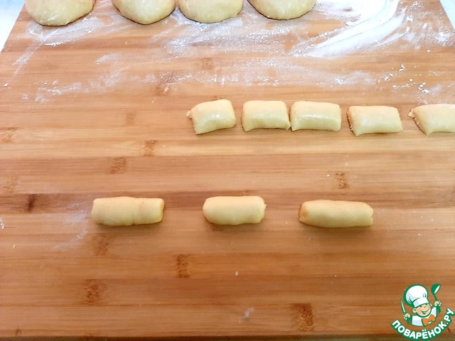 Тесто делим на 5 равных кусочков. Формируем колбаску из каждого кусочка.