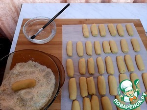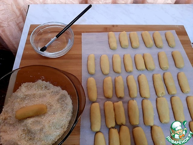 Делим колбаску на 8 равных частей. Из каждого кусочка формируем маленькие валики длиной 5 см.