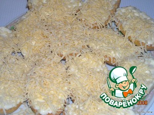 Чесночным майонезом смазать сухарики и оставить их на 30 мин. пропитаться.