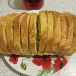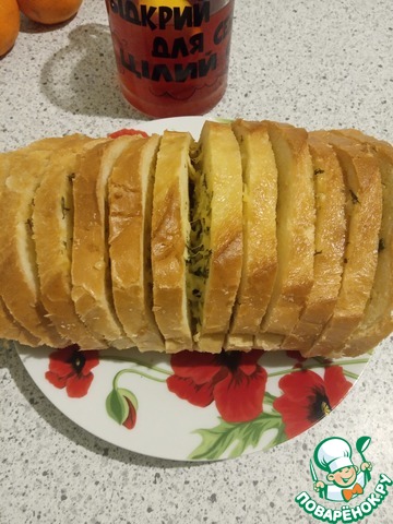 3. В батоне делаем надрезы наискосок, прорезаем не до конца. Заполняем надрезы сырной смесью.