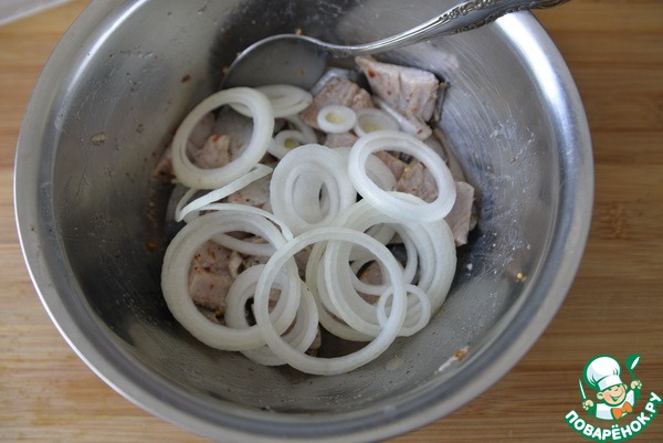 Добавляем лук, нарезанный тонкими кольцами, перемешиваем, оставляем мариноваться на 3 часа при комнатной температуре.