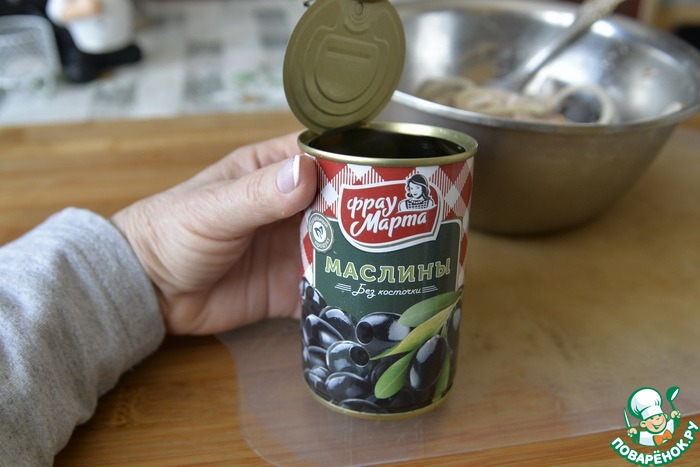 Перед подачей закуски кладём маслины. У меня без косточек, "Фрау Марта".