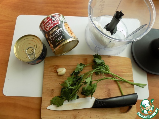Для приготовления рийета я буду использовать измельчитель. Можно воспользоваться погружным блендером, а также обыкновенной вилкой. Поместила творог, консервы рыбные, фасоль и зубчик чеснока в чашу и измельчила. Я измельчила не совсем до гладкой массы. Петрушку рубим мелко и добавляем к массе. Соединяем и выкладываем в подходящую посуду. Получился объём 250 мл примерно (1 стакан).