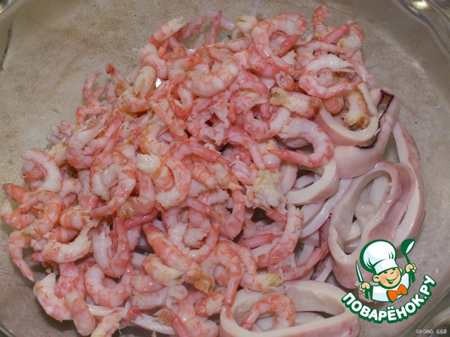 Креветки отварить в специях (лавровый лист+душистый перец горошком), остудить, почистить.
