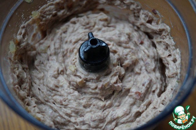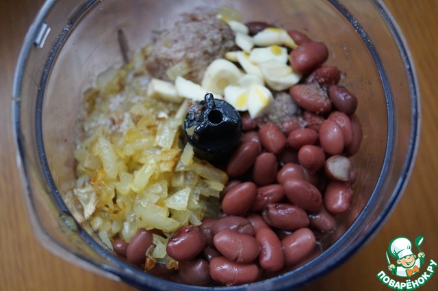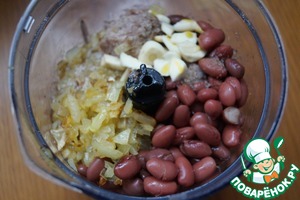 В чашу блендера сложить язык, фасоль, лук, чеснок и соль с перцем.