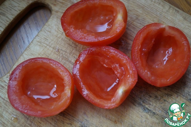 Томаты помыть, разрезать на половинки и вынуть сердцевину.