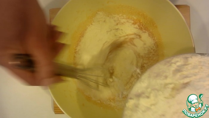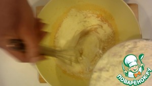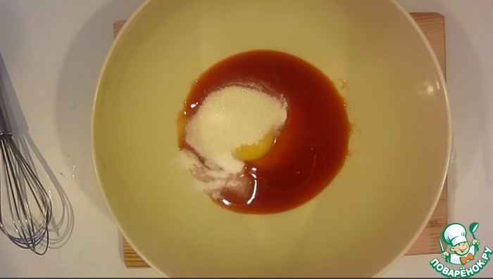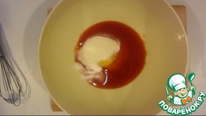 Смешиваем томатный сок, яйцо, соль, разрыхлитель, сахар и масло.