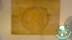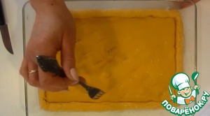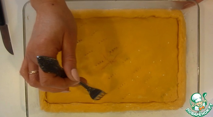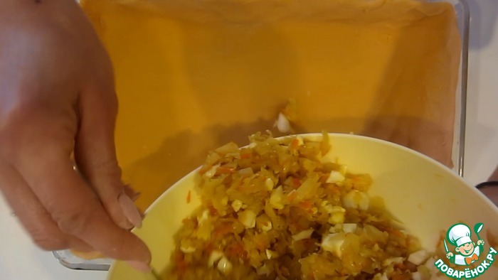 Раскатываем половину теста и укладываем на дно смазанной формы. Выкладываем начинку.