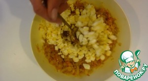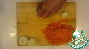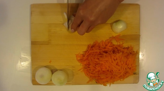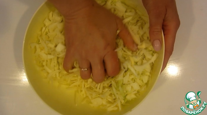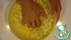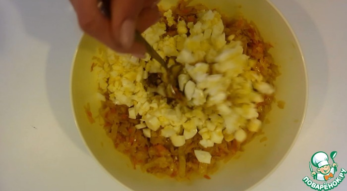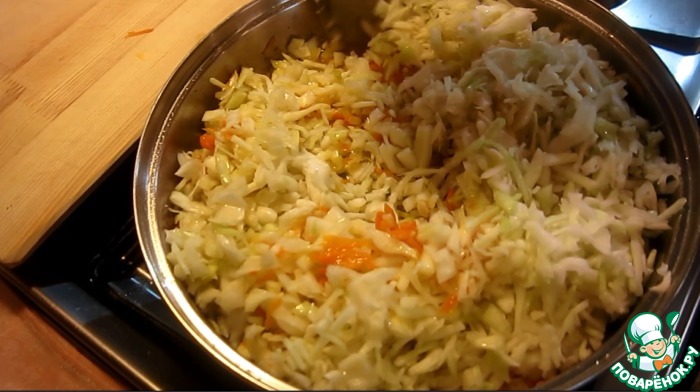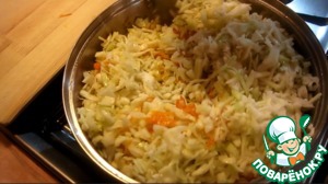 Сначала обжариваем лук и морковь, затем капусту. Солим.